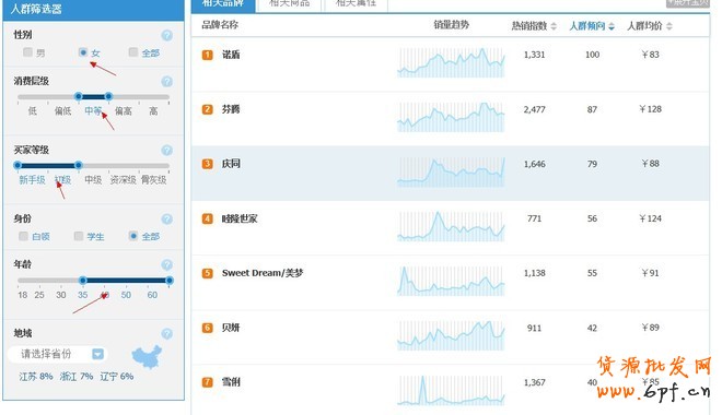 下面,我使用人群篩選器,看一下我的目標人群的情況。不同的人群,在選款和定價策略上面會有差別。這里我根據(jù)前面看到的性別丶年齡和買家等級來篩選。這里會發(fā)現(xiàn)不同的人群喜好是不同的。