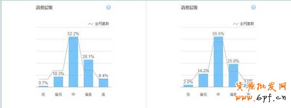 柱形是這個(gè)詞的消費(fèi)基數(shù),線型全網(wǎng)的消費(fèi)基數(shù)?;旧隙际侵袑酉M(fèi)等級(jí)居多。