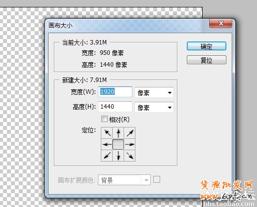6.現(xiàn)在點擊菜單欄-圖像-畫布大小,仍舊注意定位先中間的方塊,寬度、長度的單位調整為像素,寬度調整為1920,高度默認,設置如下: