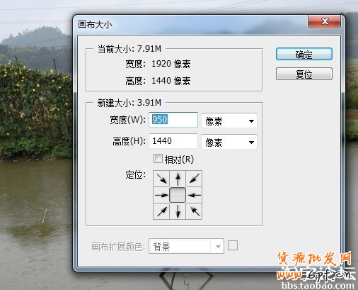 3.  然后點選菜單欄-圖像-畫布大小,注意定位先中間的方塊,寬度、長度的單位調整為像素,寬度調整為950,高度默認,如下所示: