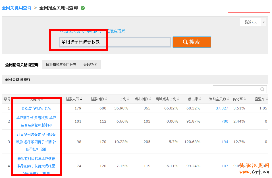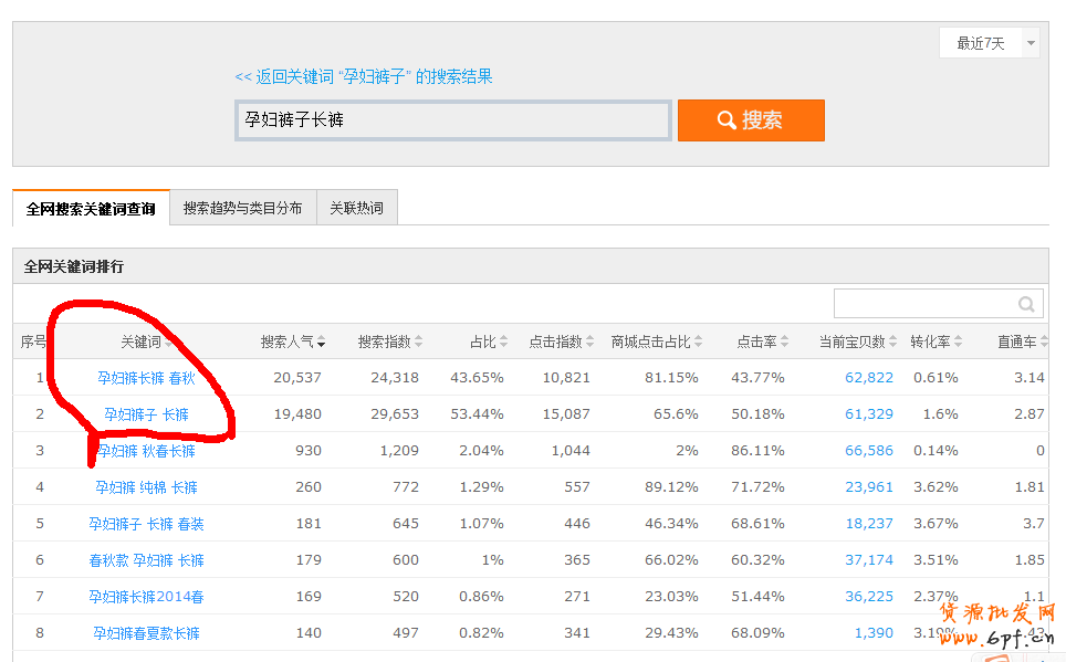 我們來看看通過魔方搜出來的孕婦褲下面幾個流量比較大的詞,在淘寶里面的排名