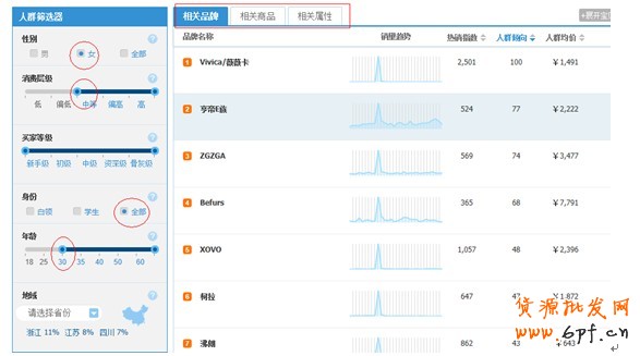 我們可以根據(jù)自己的定位調(diào)整人群篩選器,調(diào)整好人群是非常關(guān)鍵的。例如我們到底定位的是高端丶中端還是低端,定位的人群是全部還是只針對女性或男性,然后通過人群篩選器來篩選出哪些相關(guān)品牌丶相關(guān)產(chǎn)品丶相關(guān)店鋪是我們最直接的競爭對手。如圖,我們定位的是女性客戶,消費(fèi)層級是中級,年齡在30歲以上的人群,則看右邊的變化,則會出現(xiàn)相關(guān)的品牌和商品,然后找出我們最直接的競爭對手,再來制定相應(yīng)的營銷計(jì)劃。