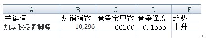 大家可以在excel的表格里分別寫上:關鍵詞丶熱銷指數(shù)丶競爭寶貝數(shù)丶競爭強度還有趨勢。接下來大家就把關于“踩腳褲”的那27個關鍵詞都復制粘貼下來,熱銷指數(shù)不用說,在后面可以看到,“趨勢”也可以在后面看到,紅色箭頭代表上升,綠色箭頭代表下降。那么競爭寶貝數(shù)和競爭強度怎么算呢?競爭寶貝數(shù)的方法很簡單也很原始,就是把相應的標題去淘寶里面搜就可以了,搜出來的寶貝數(shù)是多少就是多少(其實如果有數(shù)據(jù)魔方的話,這里就非常簡單的,我們要說的就是在沒有數(shù)據(jù)魔方的前提下該如何來分析)。