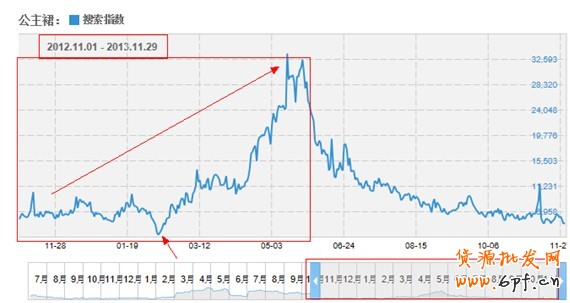 我們把下面的小三角拖到去年的11月份,就會出現(xiàn)從去年11月份到今年11月份的一個整體的發(fā)展趨勢。大家看下我用大紅框起來的那個區(qū)域,它是一個什么趨勢呢?我們可以看到,從雙11的井噴,到2013年的2月份,整體上一直都是呈現(xiàn)下降的趨勢,然后一直到2月上旬的時候,也就是從去年的2月10號開始,才開始有走高的趨勢。