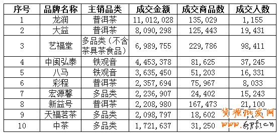 據(jù)權(quán)威資料顯示,2013天貓雙“十一”茶葉類目的銷售前十依次為龍潤、大益、藝福堂、中閩弘泰、八馬、彩程、宏源馨、新意號、天福茗茶、中茶。其中,排名第一的龍潤在“雙十一”當(dāng)天的銷售額約為1101萬,銷售商品數(shù)量在13.5萬左右,排名第二的大益總銷售額約為809萬,銷售數(shù)量為12.5萬。