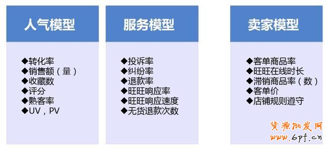 以上淘寶最基礎(chǔ)的六個模型,下面我們講一下影響店鋪搜索權(quán)重最核心的3個模型:賣家模型、服務(wù)模型和人氣模型。