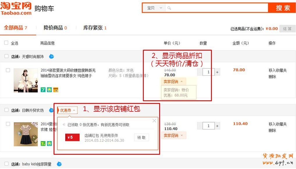 5、購(gòu)物車,也是會(huì)自動(dòng)穿透,大家在營(yíng)銷中心創(chuàng)建的 紅包/天天特價(jià)/清倉(cāng)活動(dòng)