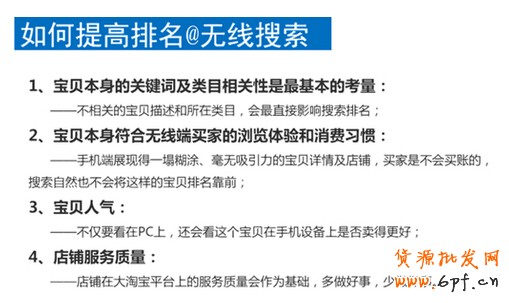 無線搜索:算法承襲了PC淘寶搜索的引擎技術(shù)和相關(guān)性算法,在搜索商品結(jié)果集和搜索排序基礎(chǔ)權(quán)重上保持一致的同時,也會根據(jù)手機(jī)淘寶買家的差異化行為習(xí) 慣(ID定向:年齡丶星座丶興趣愛好丶瀏覽過的信息等),對搜索結(jié)果在展現(xiàn)和排序上加以調(diào)整和優(yōu)化,提供給移動終端用戶以更好的搜索體驗。這說明了無線自 然搜索規(guī)則基本上已經(jīng)與PC相似,而且也開始著重“個性化”搜索結(jié)果。在這樣的情況下,我們該如何提高自然搜索排名呢?