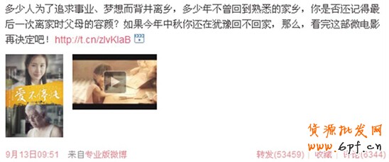 以父愛為主線的 《愛不停燉 1》,講訴的是一位年邁老父親中秋節(jié)歷經(jīng)千辛萬苦,為忙于工作而中秋節(jié)無法回家的女兒送去燉好的止咳雪梨湯。國人心中最柔軟的親情瞬間被擊中,不少看過微電影的用戶表示被故事感動流淚。此時,策劃方同步在微博上發(fā)起的 #中秋節(jié)你回家嗎# 話題,也順勢占據(jù)了新浪微博話題榜榜首。