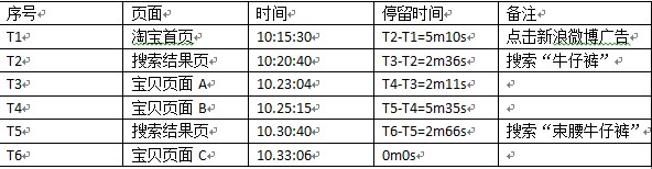 頁面停留時間的長短是否就決定了網(wǎng)頁、產(chǎn)品和設(shè)計受歡迎的程度呢?我們還是要具體問題具體分析。用戶購物過程基本路徑是:淘寶首頁->搜索結(jié)果頁->寶貝頁面A、B、C 。一般的邏輯判斷頁面停留時間是:用戶離開頁面的時間-進入頁面的時間,那么我們來看如下例子: