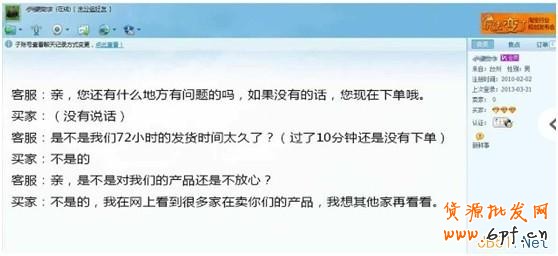 2、我想貨比三家 不管客戶是真的拒絕還是假的拒絕,客戶不可能馬上就改變主意。如果客服指導(dǎo)競爭對手價格更高,也不能馬上告訴買家,讓買家匆忙做出決定。因為這樣如果后續(xù)商品有問題,買家會認為是我們逼迫下買的,會把責(zé)任推向客服。而且買家有可能只是短暫離開,如果我們還是纏著不放,會讓買家產(chǎn)生抵觸心理。我們一定要和買家保持良好的關(guān)系,即使這次做不成生意,但也許下次他會主動找到你。我們再來看一個案例: