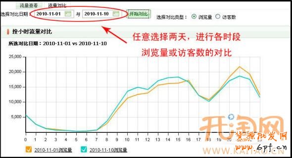 “流量對比”功能,可以讓您同時對比任意兩天的瀏覽量和訪客數(shù)信息:
