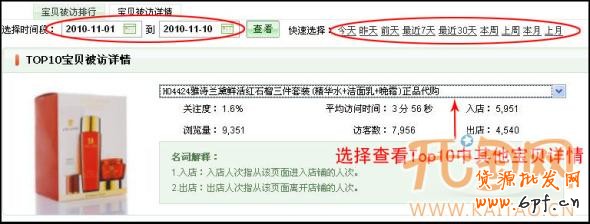 “寶貝被訪詳情”提 供排名TOP10的寶貝被訪詳情信息,包括關(guān)注度、瀏覽量、訪客數(shù)、平均訪問時間、入店和出店次 數(shù)等,并清晰地顯示出查詢?nèi)掌趦?nèi)寶貝每天的瀏覽量和訪客數(shù)。在頁面的上方您可以選擇不同的時段查看數(shù)據(jù),寶貝圖片右側(cè)的下拉菜單可用來選擇查看TOP10 中其他寶貝的詳情,在頁面的下方是寶貝被訪趨勢圖以及寶貝訪問來源和訪問地區(qū),幫助您多角度了解寶貝信息: