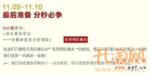 在眾多送優(yōu)惠券的方法中,以簽到的方式來贈(zèng)送算比較獨(dú)特的。所謂簽到優(yōu)惠券,即每天到相應(yīng)的店鋪點(diǎn)擊領(lǐng)取優(yōu)惠券的相應(yīng)按鈕,領(lǐng)取優(yōu)惠券。這種方式可以讓消費(fèi)者每天都能關(guān)注到店鋪的新動(dòng)向。