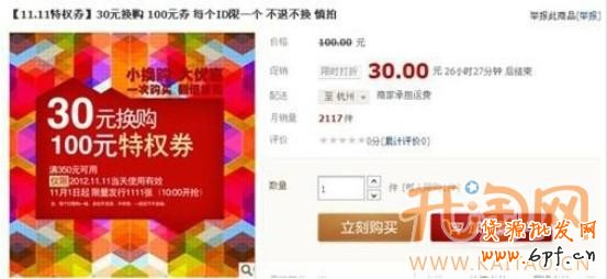 具體玩法:該賣家規(guī)定其特權(quán)券的購買時(shí)間為2012年11月1日至11月10日,發(fā)放特價(jià)券的時(shí)間為11月10日18點(diǎn)之前。此款特價(jià)券的購買價(jià)格為30元,當(dāng)顧客在“雙十一”當(dāng)天購買商品滿350元時(shí),可以用此優(yōu)惠券抵扣100元。因而在此賣家購買350元的商品時(shí),實(shí)際可優(yōu)惠70元(扣除買特權(quán)券的30元)。而當(dāng)消費(fèi)者“雙十一”當(dāng)天購物金額不滿350元,該特權(quán)券無法使用;當(dāng)特權(quán)券逾期不用時(shí),特權(quán)券作廢,且購買特權(quán)券的30元也不會(huì)返還給消費(fèi)者。