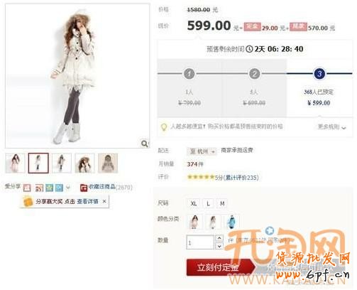 具體玩法:商家規(guī)定從10月15日0點(diǎn)開始至11月10日23點(diǎn)之間可以為A款商品預(yù)付定金29元。當(dāng)有1人下單預(yù)購時(shí),A的價(jià)格為799元;當(dāng)有2~5人購買此款商品時(shí),A的價(jià)格則調(diào)整為699元;當(dāng)購買人數(shù)超過5人購買此款商品時(shí),此款的商品價(jià)格則調(diào)整至商家設(shè)定的最低價(jià)格599元,并且不管購買人數(shù)增加與否,商品的價(jià)格都不再調(diào)整。