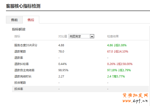 我們可以看到,對比同層商家,這家店鋪的DSR稍微低一點(diǎn),退款糾紛率也低。注意,雖然店鋪跟同層商家比退款糾紛率低,但是考核是跟同行所有商家PK,所以這個數(shù)據(jù)的參考意義不大。