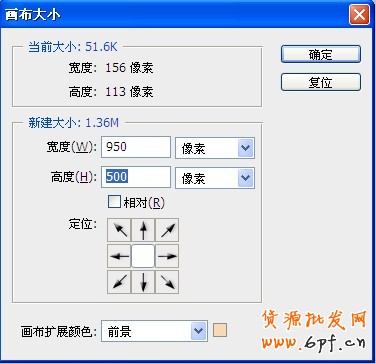 這里設(shè)置為寬度“950”高度“500”,注意單位是像素,畫布擴(kuò)展顏色選擇“前景”,如圖: