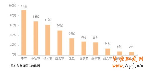 具體到逢年過(guò)節(jié),春節(jié)、中秋節(jié)、情人節(jié)、圣誕節(jié)送禮的比例都超過(guò)50%,是中國(guó)送禮的四大節(jié)日。其中春節(jié)送禮比例最高,達(dá)到91%;中秋節(jié)緊隨其后,達(dá)到68%。對(duì)于企業(yè)來(lái)說(shuō),開(kāi)發(fā)針對(duì)這四個(gè)節(jié)日的定制禮品或禮品裝具有較大的市場(chǎng)機(jī)會(huì)。