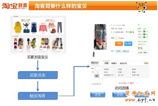 首先我們一起來了解下淘客需要什么樣的寶貝,這一個是整體的一個由展現給買家,到最后買家購買的流程,首先是買家在淘客站點進行瀏覽寶貝,買家對這個寶貝產生了興趣,進行了點擊,從而觸發(fā)了網站的淘客鏈接,使用淘客鏈接進行訪問店鋪,在店鋪中,買家進行正常的瀏覽、咨詢,最后進入購買付款,這樣一套的流程,最終使買家買到看上的寶貝,而淘客也賺取了對應的傭金