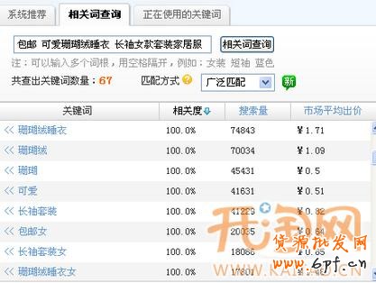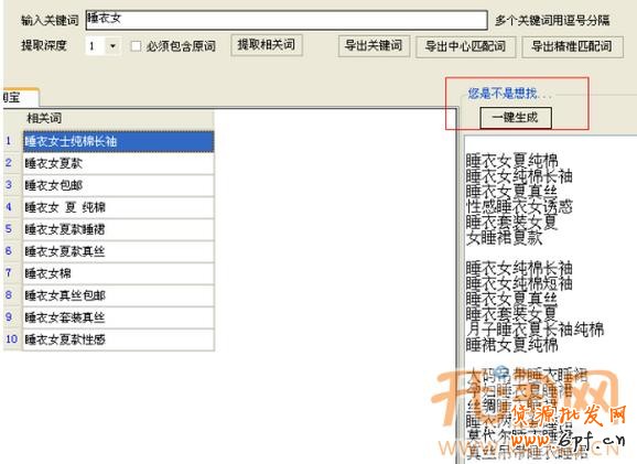 打開該工具,輸入一個中心詞,比如“睡衣”“睡衣女”,點擊提取相關詞,等下面關鍵詞出現(xiàn)完畢后,點擊導出關鍵詞,就可以保存搜到的詞,這部分就是淘寶首頁搜索框下的熱門詞,我們可以在里面挑選適合推廣寶貝的關鍵詞去添加。