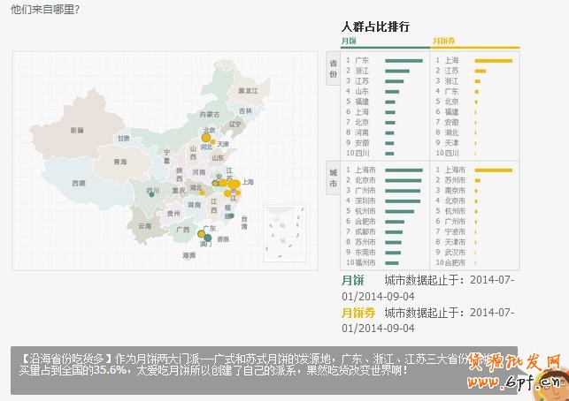 買月餅的買家大多數(shù)來自沿海省份,單單就廣東省、浙江省、江蘇省這三個(gè)大省份的月餅購(gòu)買量就占據(jù)了全國(guó)月餅購(gòu)買數(shù)量的35.6%,由此可見,這三省對(duì)于月餅的喜愛程度多么深呀!