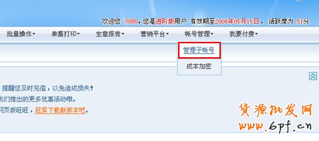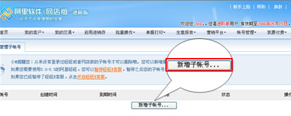 | 還是“網(wǎng)店版”頁面,在“帳號管理”下面,選擇“管理子帳號”,如圖: | |||||||||