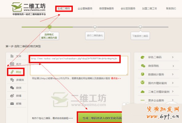 進(jìn)入二維工坊----點(diǎn)擊“生成二維碼”----選擇網(wǎng)址----粘貼上面修改好的店鋪專屬鏈接地址---生成二維碼并進(jìn)入DIY美化。