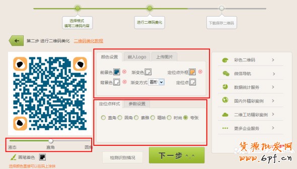 看下圖哦,可以定義定位點(diǎn)、背景、前景,等顏色,并可以采用漸變的方式。還可以改變樣式。更多的樣式自己去體驗(yàn)試試吧。有些朋友想嵌入自己的店標(biāo),這里也可以得到完美解決哦。