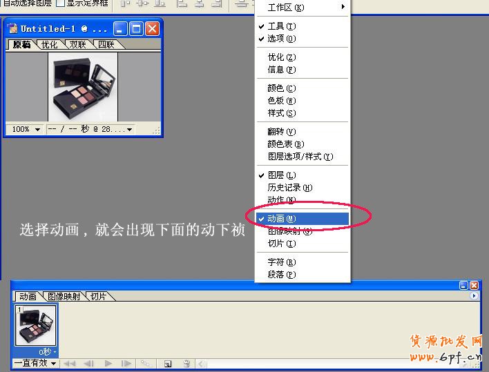 下面就是轉(zhuǎn)到ImageReady的畫面。然后選擇窗口菜單——選動(dòng)畫——就出現(xiàn)在動(dòng)畫禎,如圖: