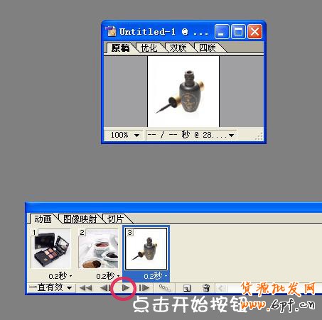 第五步:要做動(dòng)畫了,點(diǎn)擊指定的工具,跳轉(zhuǎn)到做動(dòng)畫的ImageReady軟件里。如圖: