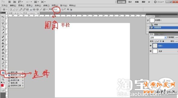 4、選擇“圓角矩形工具”,半徑改為“5像素”,這個(gè)大小,你可以自己多試試,數(shù)值越大,圓角效果越明顯,每個(gè)值都多調(diào)調(diào),也許有意想不到的效果 。