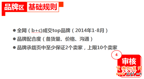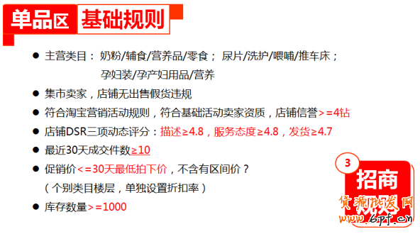 招商規(guī)則方面,進駐母嬰會場品牌區(qū)的品牌需是2014年1月至8月的全網(B+C)成交top品牌,且備貨量、價格等滿足大促要求。賣家需來自集市,且無售假貨違規(guī)記錄,店鋪信譽需要三鉆或以上,描述及服務態(tài)度需不小于4.8分,發(fā)貨速度不小于4.7分。此外,店鋪最近30天成交數(shù)不少于10件,促銷價不大于30天內最低拍下價,每個品牌承載頁至少要保證2個賣家,不超過10個。