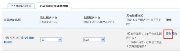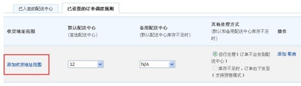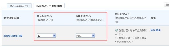 商家必須要按地域選擇默認(rèn)配送中心,如果沒有選擇時,備用配送中心不可選。如果默認(rèn)配送中心庫存不足時,可以選擇備用配送中心。