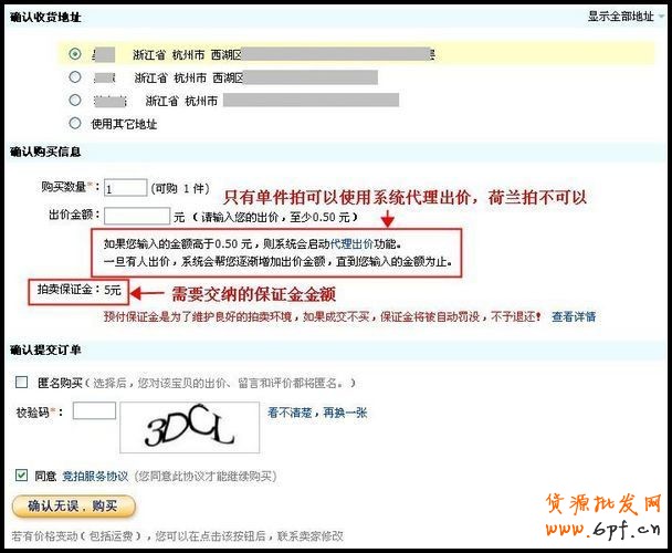 第二步:進(jìn)入到“確認(rèn)購買信息”頁面后,首先,確認(rèn)收貨地址,然后,輸入購買數(shù)量和出價金額,在出價金額一欄下方,您會看到拍賣保證金需交納金額的提示(拍賣保證金介紹),最后輸入校驗(yàn)碼,同意競拍服務(wù)協(xié)議,在確認(rèn)購買信息填寫無誤的情況下,點(diǎn)擊“確認(rèn)無誤,購買”即可。
