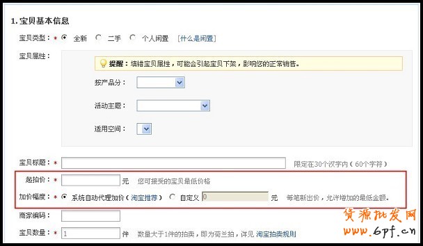 4、填寫商品屬性信息后點“發(fā)布”,商品就成功發(fā)布了。和一口價商品不同的是:拍賣的商品,需要設(shè)置起拍價,即商品最低成交價格;同時賣家還需要設(shè)置加價幅度,既可以選擇系統(tǒng)自動代理處價,也可以自己設(shè)置加價幅度。