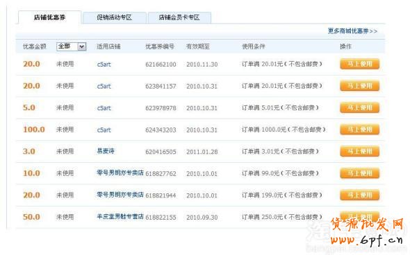 這里就是我的優(yōu)惠券了。點擊后面的黃色按鈕“馬上使用”,就可以進(jìn)入相應(yīng)的店鋪,您就可以挑選寶貝,購物使用優(yōu)惠券了。親們要注意的是,優(yōu)惠券的使用都是有設(shè)置條件的哦。 像上面有的優(yōu)惠券面值是20元,使用條件滿20.01元,說明這張優(yōu)惠券的使用幾乎是沒有限制的,只要訂單金額大于20元就可以用。還有一種面值同樣是20元,但使用條件是訂單必須滿199元,所以相對于打9折,也很優(yōu)惠,不過還是前面的那張好,嘻嘻!