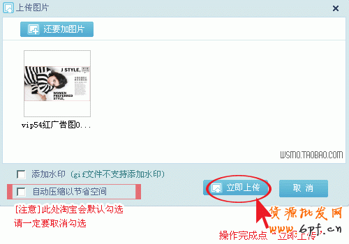 5、左下角會(huì)默認(rèn)勾選壓縮尺寸,請(qǐng)不要勾選這樣的選項(xiàng)。操作好了點(diǎn)“立即上傳”: