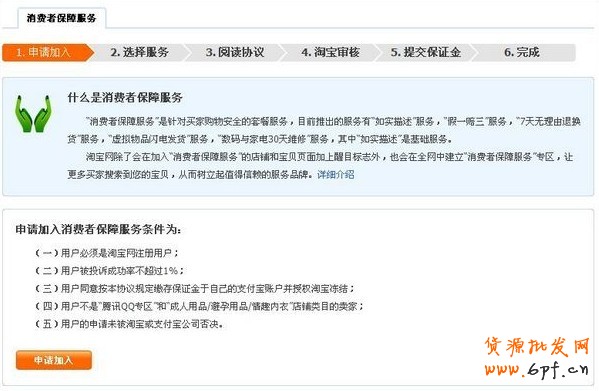 2、在申請加入之前請先確認(rèn)自己是否符合加入消費者保障服務(wù)的條件,如果符合申請要求,您可以點擊“申請加入”按鈕提交申請。