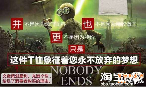 請看這個(gè)淘寶T恤銷量冠軍,文案的策劃就非常準(zhǔn)和狠,令人拍案叫絕: