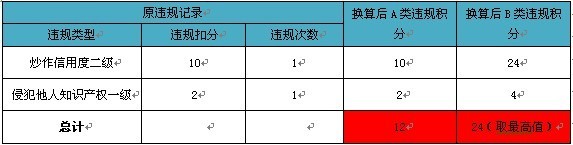 另,原規(guī)則中炒作信用度二級扣10分,侵犯他人知識產(chǎn)權(quán)處一級扣2分,則您的原違規(guī)積分為12分,轉(zhuǎn)換后的A類違規(guī)積分即為12分。