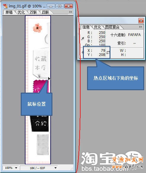 coords="x1, y1,x2,y2"中坐標的取法,用ImageReady打開上圖后,將鼠標置于“收藏圖片”區(qū)域的左上角,記下X與Y坐標,這兩個值就是X1與Y1噢。
