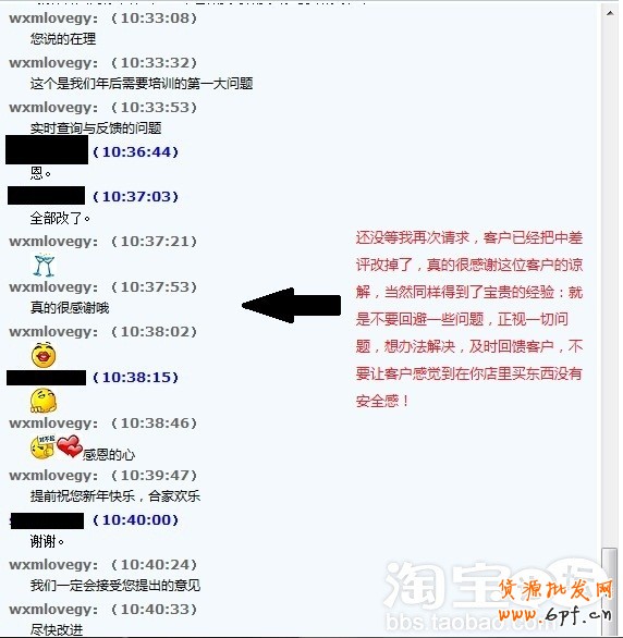 特別提醒:處理過程中一定要以謙遜的態(tài)度面對,因為畢竟在交易過程中很可能是我們出了差池,即使不是我們的錯,也要虛心聽取買家的意見吧,畢竟也是積累經(jīng)驗的一種方式,詢問過后,直入主題,尋求買家的理解,說明自己對好評的渴望,以及自己的誠意,用真誠感動上帝吧,要是對方真的是上帝,那么一般是可以諒解你的!