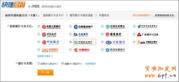 1、進入收銀臺,選擇【儲蓄卡】——中國民生銀行,點擊【下一步】;
