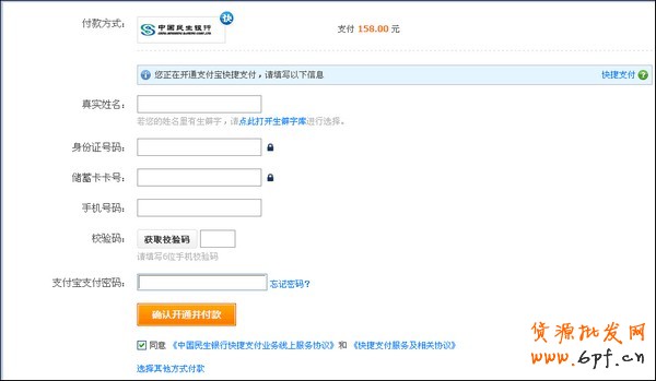 2、需要用戶填寫真實姓名、身份證號碼、儲蓄卡卡號、填寫在銀行預(yù)存的手機號碼并輸入校驗碼、支付密碼,閱讀協(xié)議,點擊【確認開通并付款】,提示成功并開通儲蓄卡快捷支付。