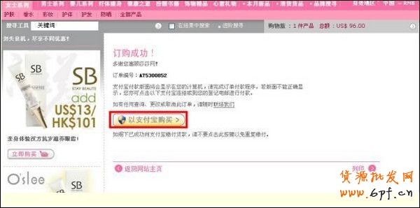 1、在sasa網(wǎng)選好相關(guān)商品之后,確認好訂單號,選擇【以支付寶購買】;
