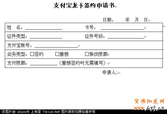 然后,向銀行申請開通支付寶卡通,銀行會給你一份《支付寶龍卡簽約申請書》。設(shè)置你的支付限額,當(dāng)日累計支付限額不超過2000元。簽約成功后,銀行打印《個人客戶聯(lián)名卡簽約回執(zhí)》。