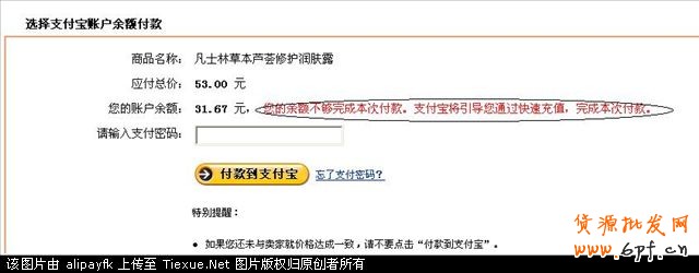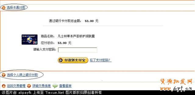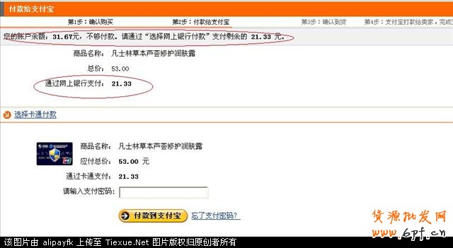 我選擇“付款到支付寶”,輸入支付寶支付密碼。這時,你可以看到,53元中的31.67已通過支付寶余額支付掉了,剩下的21.33你可以選擇卡通付款或者是用網(wǎng)上銀行支付。