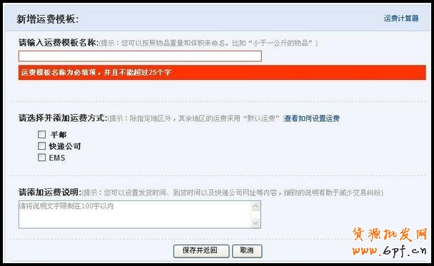 注意:運(yùn)費(fèi)模板名稱為必填項(xiàng),并且不能超過(guò)25個(gè)字。