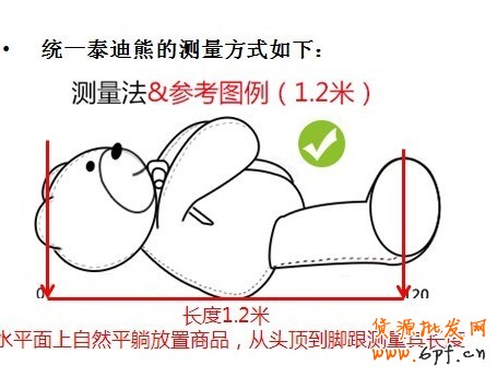 問題顯而易見,泰迪熊是大頭,而尺寸問題大頭中的大頭!!!怎么解決?一招搞定!!!——在寶貝描述里增加一組玩具尺寸的描述照片。如何描述呢,這里面可有大學問,毛絨玩具行家都應該知道,測量方法有兩種,一個叫:直角測量法,一個平量測量法,如圖: